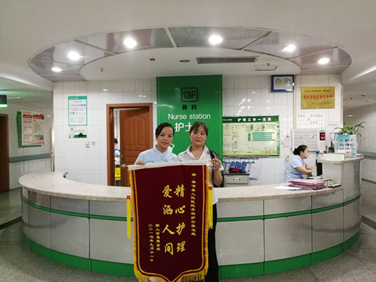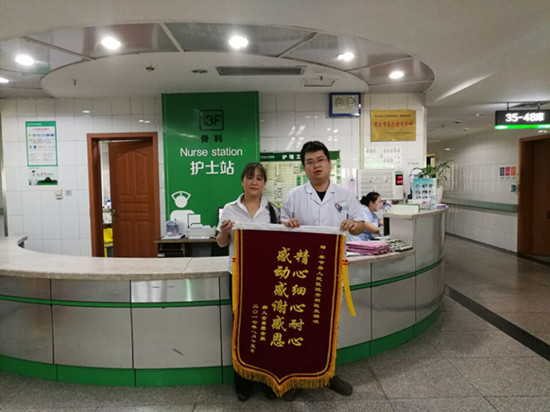 “医生护士他们总是不厌其烦的关心我,为我精心治疗和护理,让我很是感动”。金女士说。通过医护人员与患者的共同努力,患者的病情逐渐好转,慢慢能够下地行走,于9月13日好转出院。9月14日金女士特地将写有“精心细心耐心 感动感谢感恩” 、“精心护理 爱撒人间” 的锦旗送到主管医生杨峻和责任护士李名荣手中。