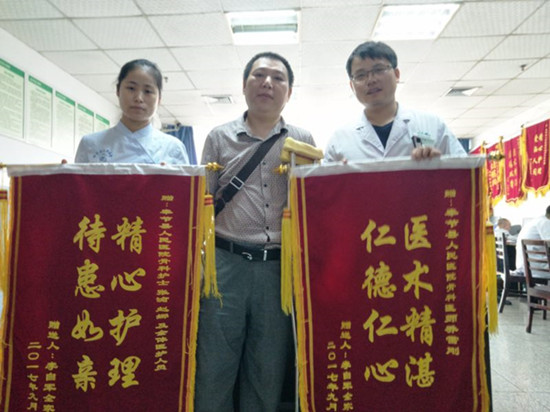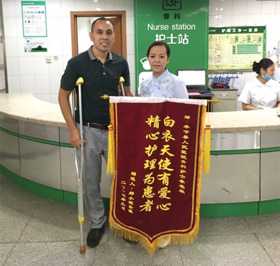 患者邓先生,因“车祸致左腓骨头骨折、左膝后交叉韧带断裂”入住我院骨科,经过完善的术前准备,于8月1日行了关节镜下左膝关节镜检、左膝后交叉韧带断裂重建术,术后患者因为怕痛而不敢进行功能锻炼,如果术后不将功能锻炼落实,患者就会因关节僵硬而影响关节的功能。主管医生乔雷刚、责任护士李名荣针对患者的这一情况,跟患者进行了很好的沟通交流,制定了针对性的康复锻炼计划,亲自动手帮助患者活动关节,指导其采用循序渐进的方式进行锻炼,对患者的每一个小小进步给予鼓励,增强了患者患者的信心。通过一个多月的恢复,患者于9月14日好转出院。9月18日患者亲自将写有“医德高尚暖人心 医术精湛传四方” 、“白衣天使有爱心 精心护理为患者”的锦旗送到主管医生乔雷刚和责任护士李名荣手中。