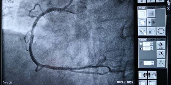 在心内科主任、胸痛中心负责人熊春林的带领下,胸痛中心介入团队紧密配合,手术顺利进行。造影证实患者发病的罪魁祸首是血管右冠近段完全闭塞,医生们立即送入导丝、球囊开通血管,并成功植入支架1枚,使患者转危为安。