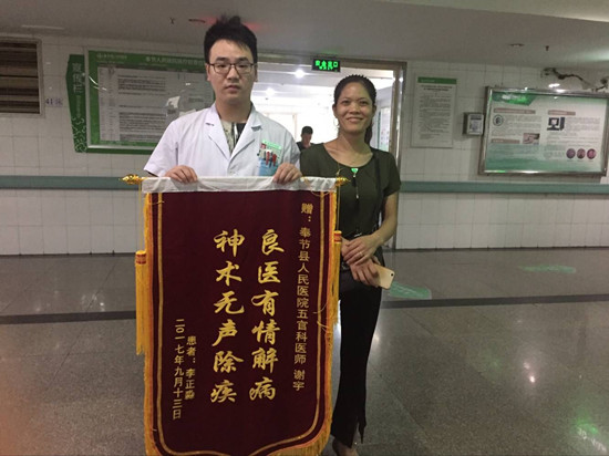 9月19日中午,在耳鼻咽喉科医生办公室,一患儿家属特地将一面绣有“良医有情解病,神术无声除疾”的锦旗送到谢宇医师手中,并一致称暂谢医生医德高尚,技术精湛。