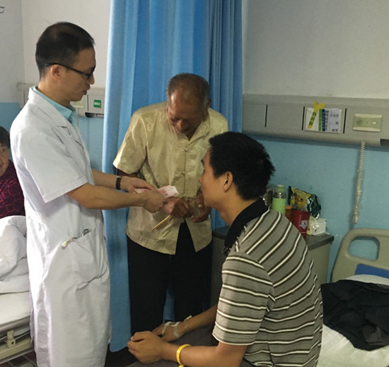 “感谢党啊,党的政策好,使我们这些穷人能看上病,也感谢你们这些医生护士,真心实意的关心我们,不是他们帮忙我也没办法住院,更别说还和儿子住一起,能照顾他。”徐某父亲边说边紧紧的握住主任熊春林的手。(心内科 邓媛)