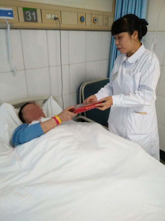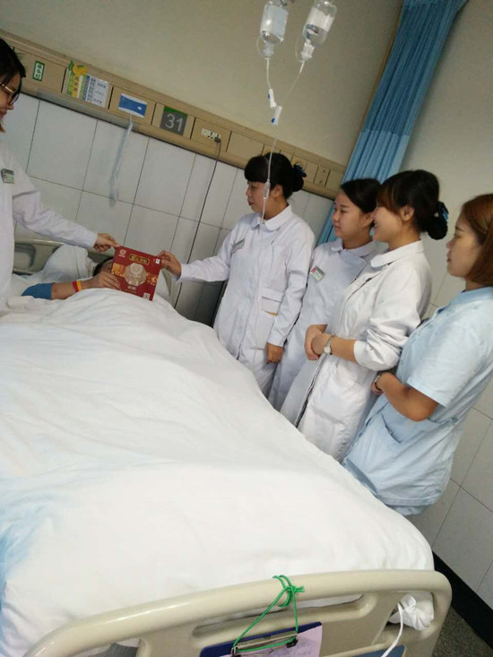 10月4日,正值中秋佳节,举家团圆、举国欢庆的日子,泌尿外科护士长王菁却无心欢度佳节,她心里牵挂着她的患者---赵继超。他是一位左肾周脓肿伴高位截瘫的患者,曾多次收住泌尿外科,全科医护人员对其家庭状况极为熟悉。他家中有一位年迈的老母亲和一个12岁的女儿正在上学。由于赵继超长期患病丧失了劳动能力,家中几亩薄田全靠老母亲勉强经营,女儿也由老母亲照料,家庭收入不稳定,生活难以为继。我科曾多次为其捐款、捐物,帮助他度过难关,利用业余时间帮他打水送饭、协助身体护理,让他感受到了医院的温暖。然而在这团圆之际,赵继超却孤零零无人陪伴。一大早王菁同志就专程买了月饼,赶到医院来看望他。