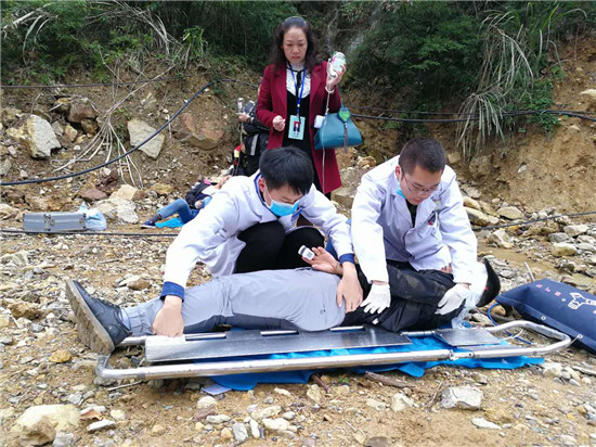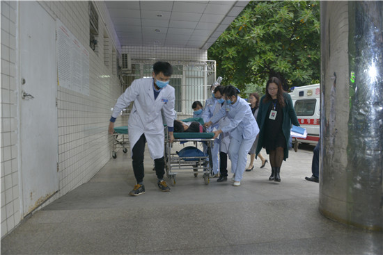 下午四点,演练正式开始。急诊科接到120调度中心电话,在李家坝污水处理厂发生山体滑坡,10余人伤势严重。急诊科立即启动科室应急预案,按流程逐级上报,安排相关科室到急诊科做好准备,同时120急救车即刻出发赶往事发现场。