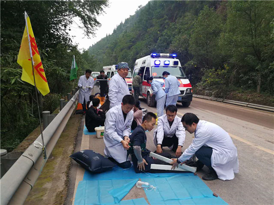 第一辆救护车抵达现场后,医护人员评估环境,根据伤情的严重程度,及时捡伤,分区救治,对危重伤员分别给予止血、包扎、骨折固定、建立静脉通道、吸氧等对症处理。并告知急诊科约15分钟后抵达医院。