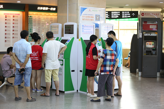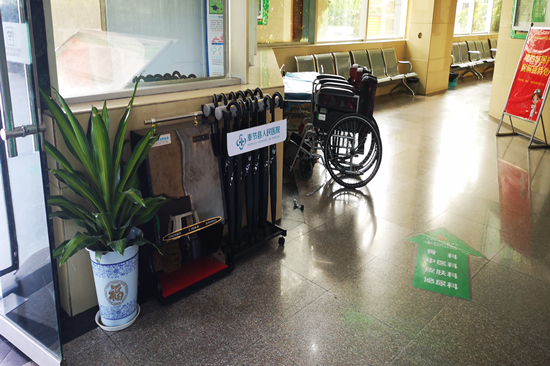 除此之外,在县人民医院门诊大厅,还能看到导医、志愿者帮助就诊患者使用自助挂号收费机实施挂号缴费,在指定的区域大家还可以自主扫描二维码,在网上完成预约服务。在门诊入口处,人性化的在摆放了平车、轮椅、雨伞、拐杖、自动擦鞋机等用品。