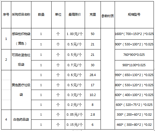 备注:要求必须符合采购商品的尺寸大小和克重,成品袋无臭味,克重上下浮动不超过5%。 参数要求: 1、生物可降解塑料袋符合: 达到GB/T19277.1-2011降解标准,达到GB/T38082-2019生物降解塑料购物袋降解标准。 2、生物可降解塑料袋须提供省级质量检测合格报告,生物可降解环保颗粒须提供国家塑料制品质量监督检测中心检测合格报告,产品供应商需提供生物降解塑料袋生产厂家销售授权书以及对保证国家检测机构检测合格的承诺函。 3、有专利权可附专利证书。 4、产品包装上注明生产厂家,产品名称,批号或生产日期,并附有质量检测合格证。 现将该条修改为: 1.白色药品袋和医疗垃圾袋 备注:要求必须符合采购商品的尺寸大小和克重,成品袋无臭味,克重上下浮动不超过5%。 参数要求: 1、生物可降解塑料袋符合: 达到GB/T19277.1-2011降解标准,达到GB/T38082-2019生物降解塑料购物袋降解标准。 2、生物可降解塑料袋须提供省级质量检测合格报告,生物可降解环保颗粒须提供国家塑料制品质量监督检测中心检测合格报告,产品供应商需提供生物降解塑料袋生产厂家销售授权书以及对保证国家检测机构检测合格的承诺函。 3、有专利权可附专利证书。 4、产品包装上注明生产厂家,产品名称,批号或生产日期,并附有质量检测合格证。 二、其他信息不变。